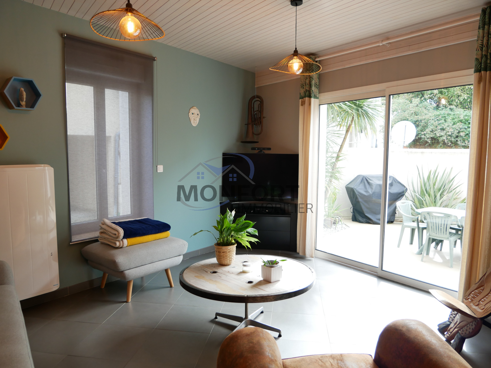 L'extérieur a été entièrement aménagé pour offrir un cadre de vie agréable et sans entretien. La terrasse est idéale pour profiter des beaux jours, agrémentée de murs végétalisés et d'un puits, parfait pour l'arrosage.