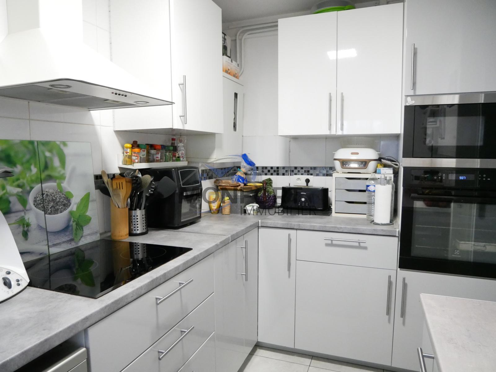 Au rez-de-chaussée, l’entrée dessert un séjour, une cuisine fermée et meublée, ainsi qu’un accès direct au garage, où se trouvent également des toilettes.